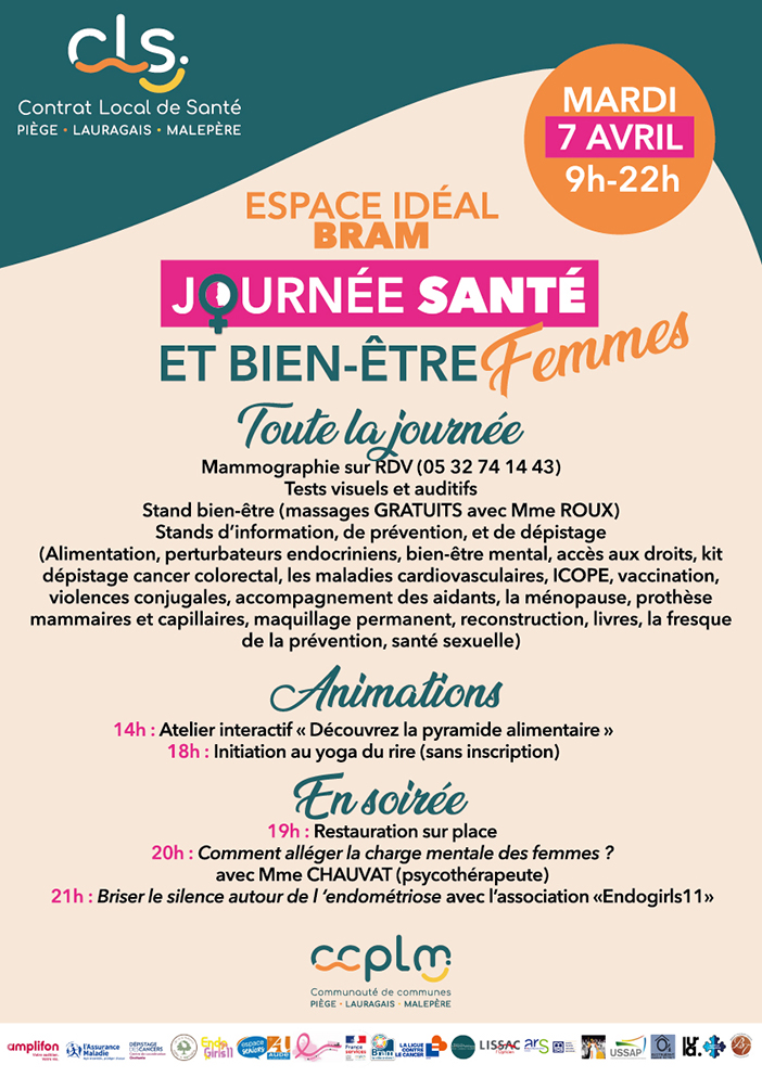 Dans le cadre du Contrat Local de Santé porté par la CCPLM, nous avons le plaisir de vous informer de l’organisation d’une Journée Santé et Bien-être dédiée aux femmes, qui se tiendra :